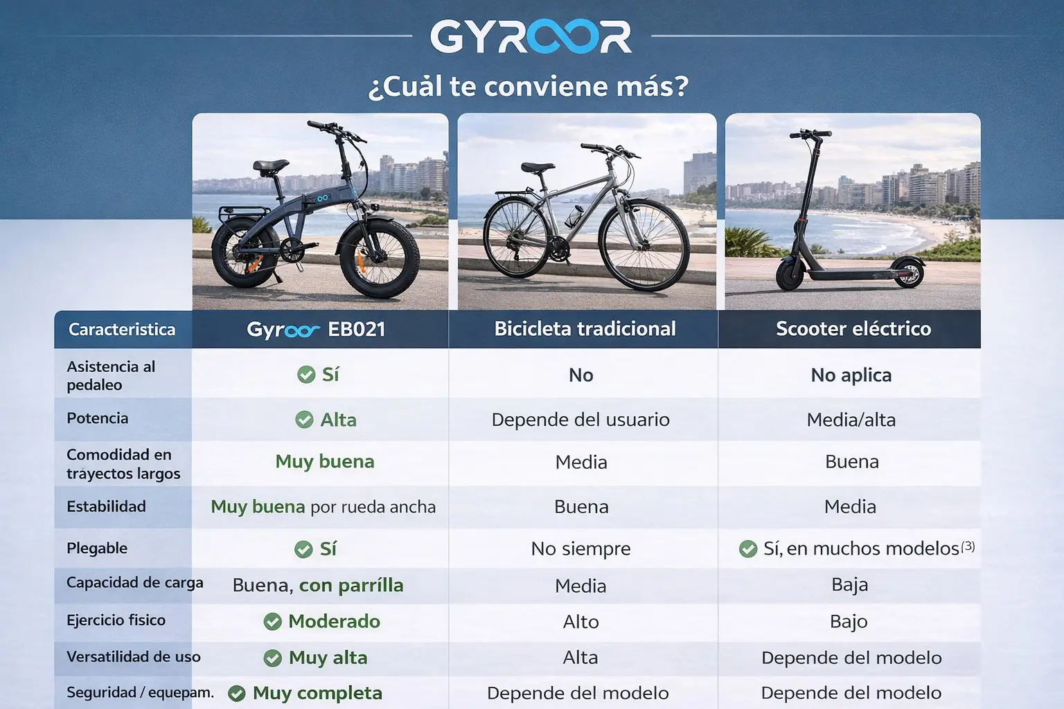 Movete con estilo y potencia por la ciudad o caminos ligeros con la bicicleta eléctrica Gyroor EB021, una e-bike plegable diseñada para adultos. Su plegado rápido y su marco de aleación de aluminio la hacen fácil de guardar o transportar, mientras que las ruedas anchas de 20″ ofrecen estabilidad y confort. Equipada con un motor de 500 W (48 V) y una batería de 499 Wh / 48V, alcanza una velocidad máxima de 35 km/h. Tiene 5 niveles de asistencia para adaptar el pedaleo a tus necesidades, más un sistema SHIMANO de 7 velocidades para manejar diferentes terrenos. Su autonomía puede ir de 35 a 70 km, según el modo y terreno. Además, incluye freno de disco mecánico, luces delantera y trasera, guardabarros, parrilla, bocina, señalizadores y soporte para celular. Perfecta para quienes buscan movilidad práctica, potente y eficiente.