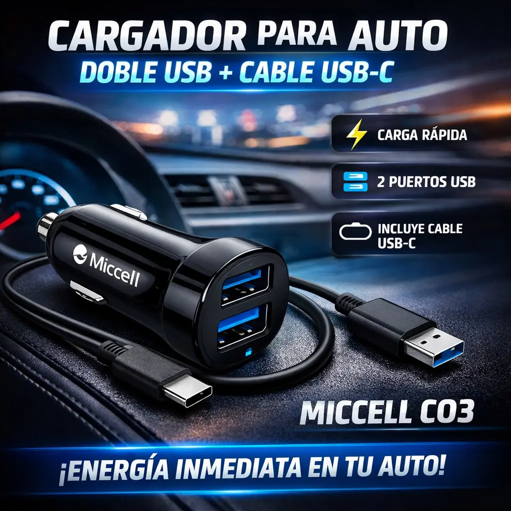 El Cargador Para Auto Miccell C03 2 USB con Cable USB-C es la solución práctica y potente para mantener tus dispositivos cargados en todo momento.