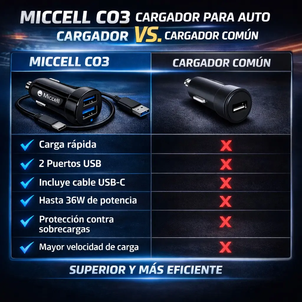 El Cargador para Auto Miccell C03 está diseñado para quienes necesitan energía rápida, segura y confiable mientras conducen. Gracias a sus 2 puertos USB de alta eficiencia, permite cargar simultáneamente dos dispositivos sin afectar el rendimiento.