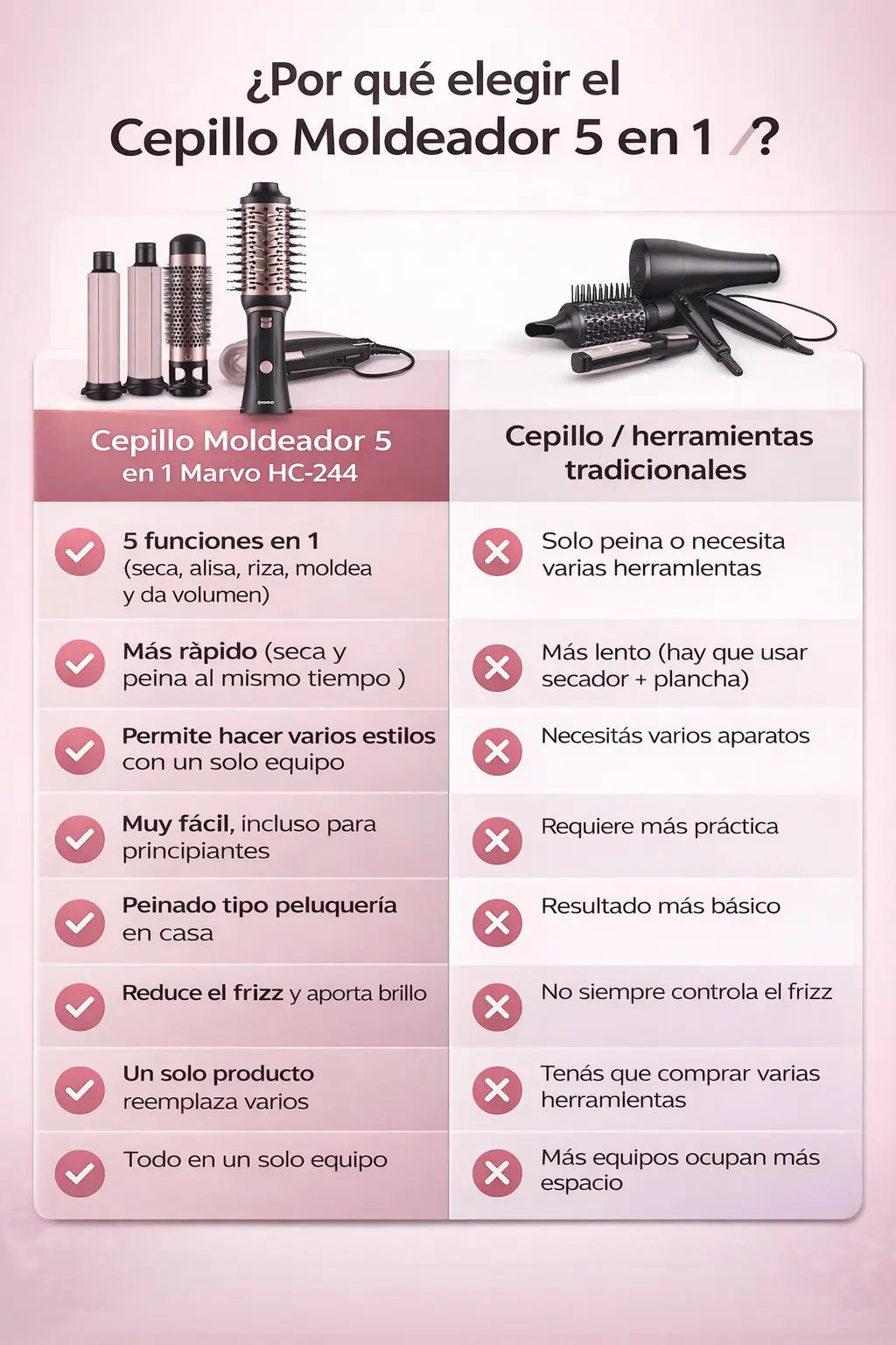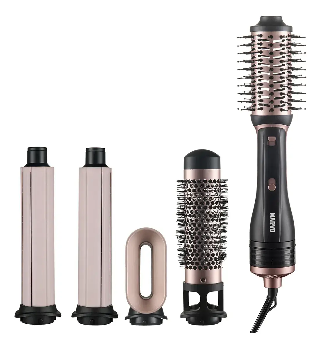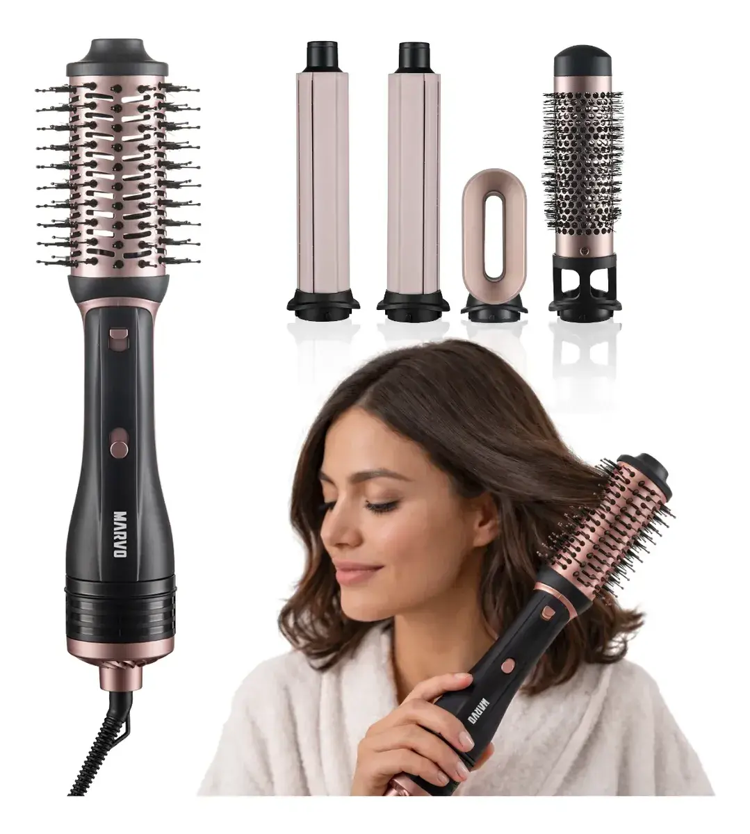 Transformá tu rutina de peinado con el Cepillo Moldeador 5 en 1 Marvo HC-244, una herramienta versátil diseñada para secar, alisar, ondular y dar volumen al cabello de forma rápida y sencilla.