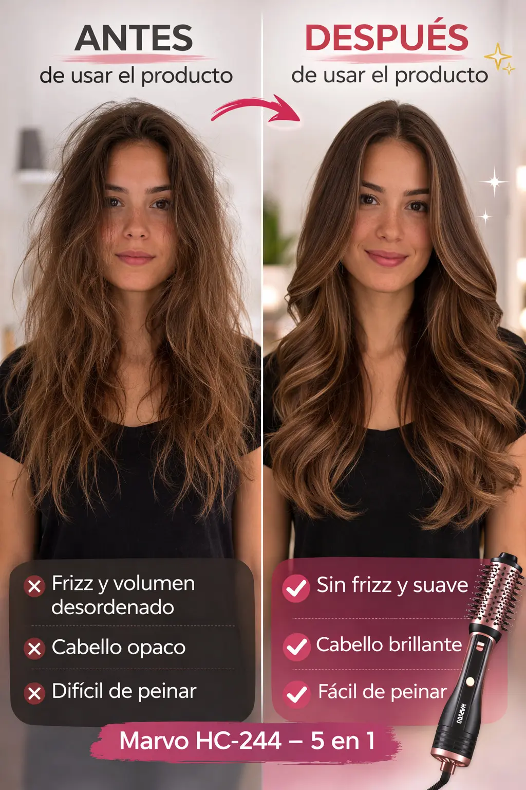 Sí. El Marvo HC-244 funciona en cabello liso, ondulado o con frizz, ayudando a alisar, dar volumen o crear ondas fácilmente.
