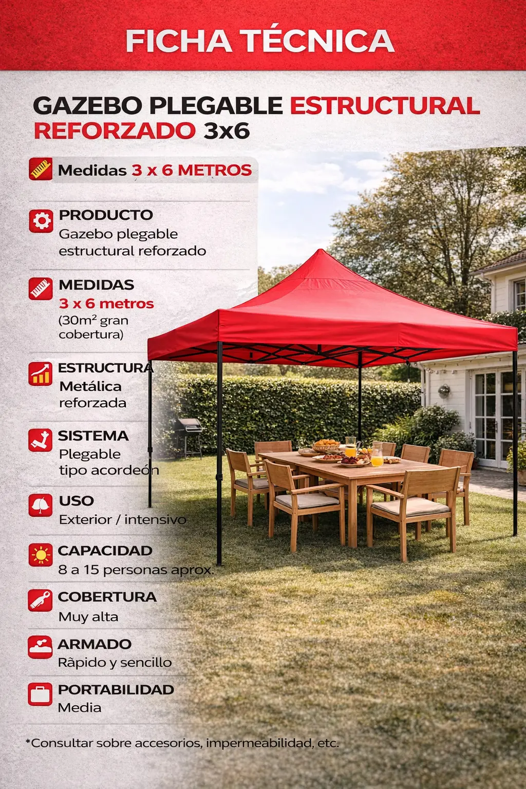 Protegé un espacio amplio en comparación con gazebos tradicionales. Ideal para grupos grandes.