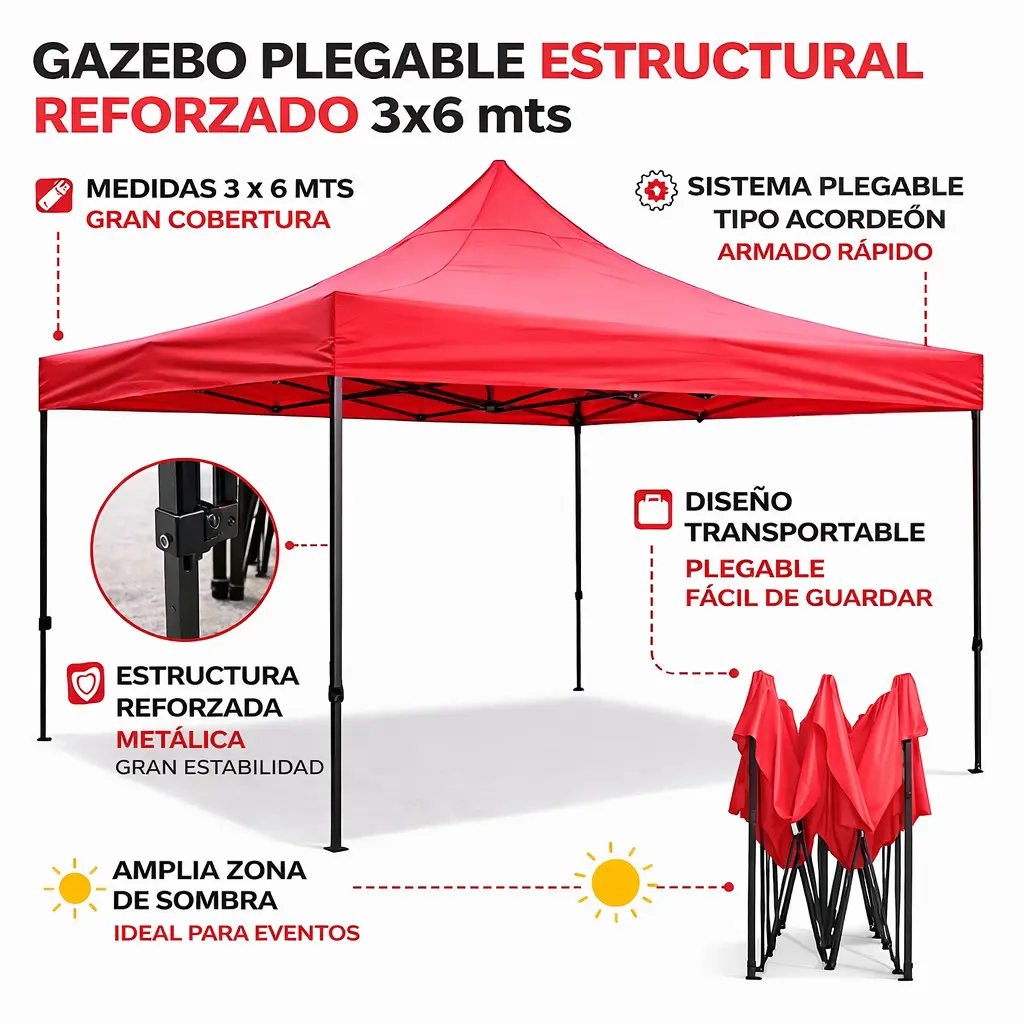 Llevá tus espacios al siguiente nivel con el Gazebo Plegable Estructural Reforzado 3x6 mts, una solución ideal para quienes buscan máxima cobertura, resistencia y presencia profesional en exteriores.