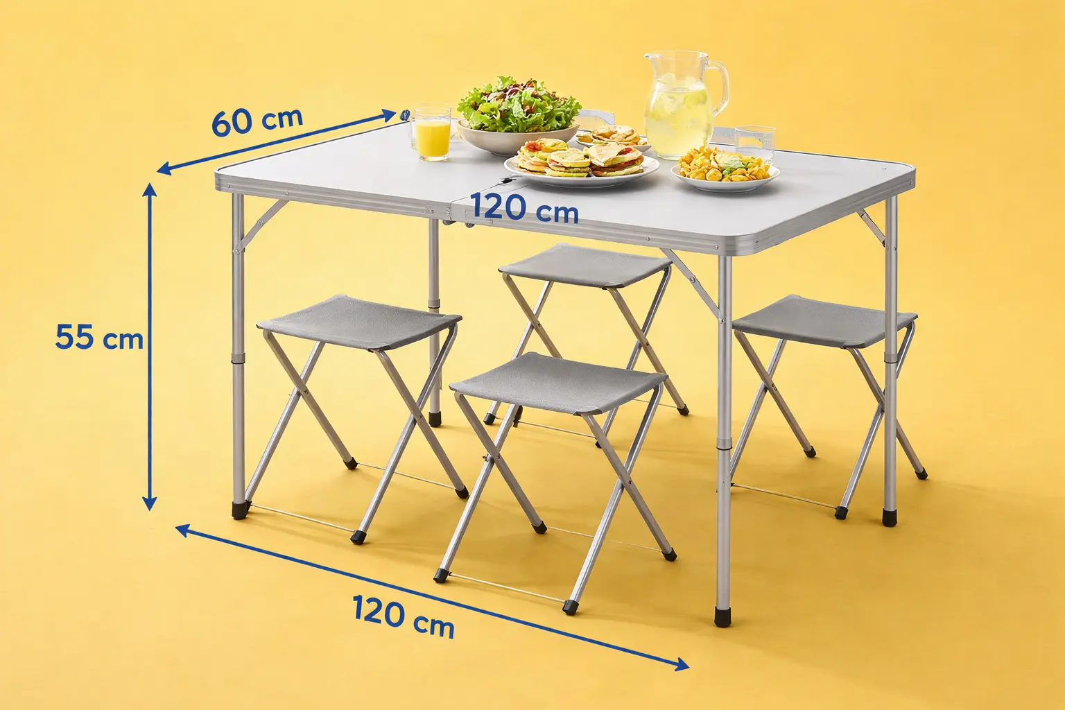 Disfrutá tus salidas al aire libre con esta mesa plegable de camping con bancos, pensada para quienes buscan una solución práctica, cómoda y fácil de transportar.