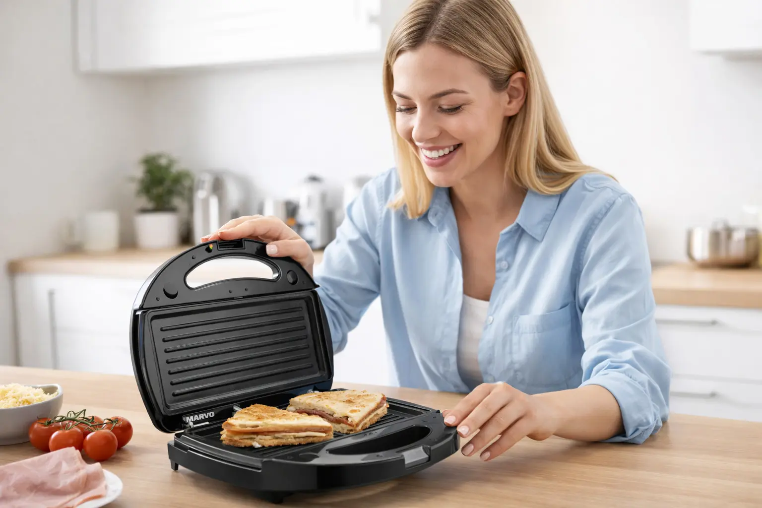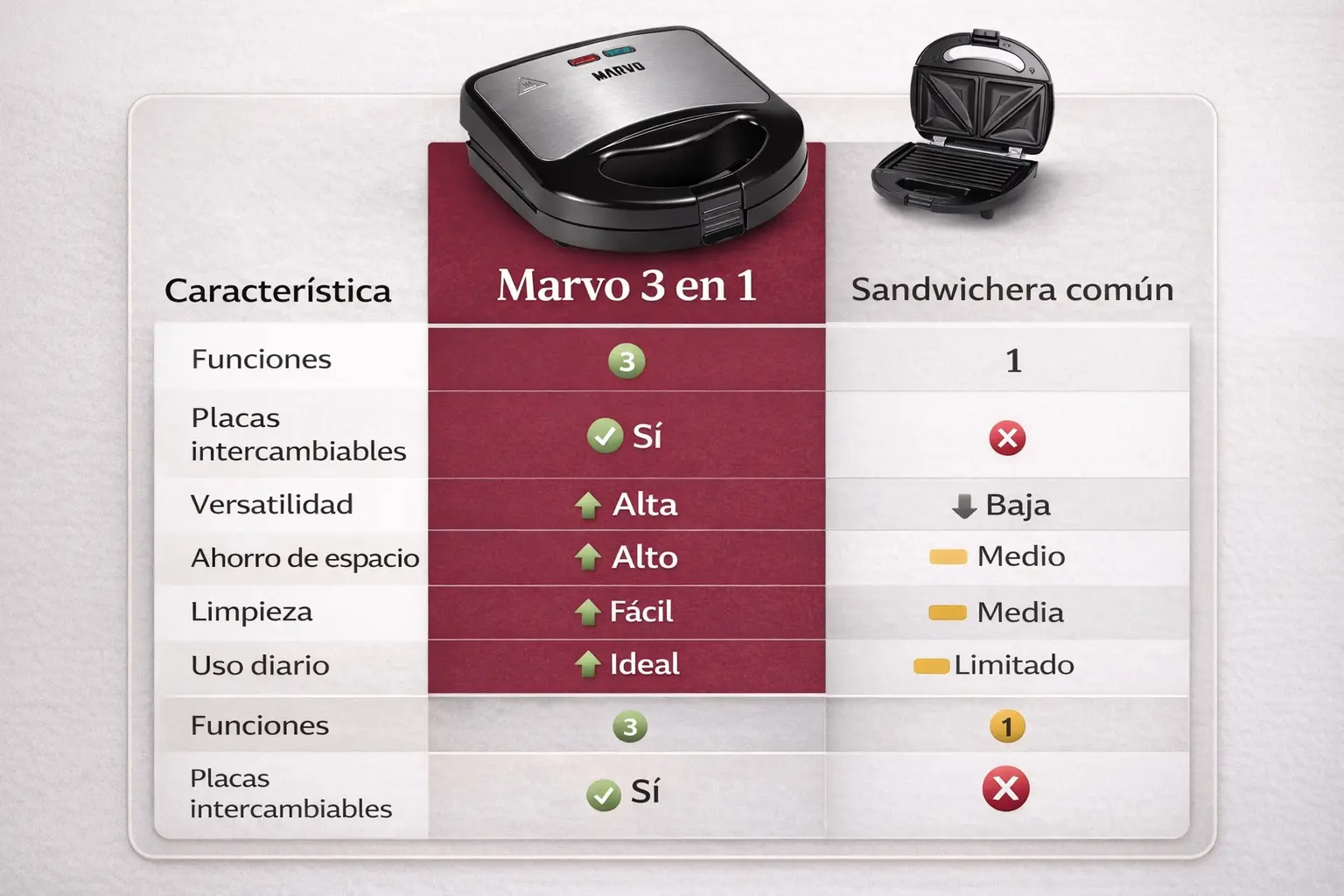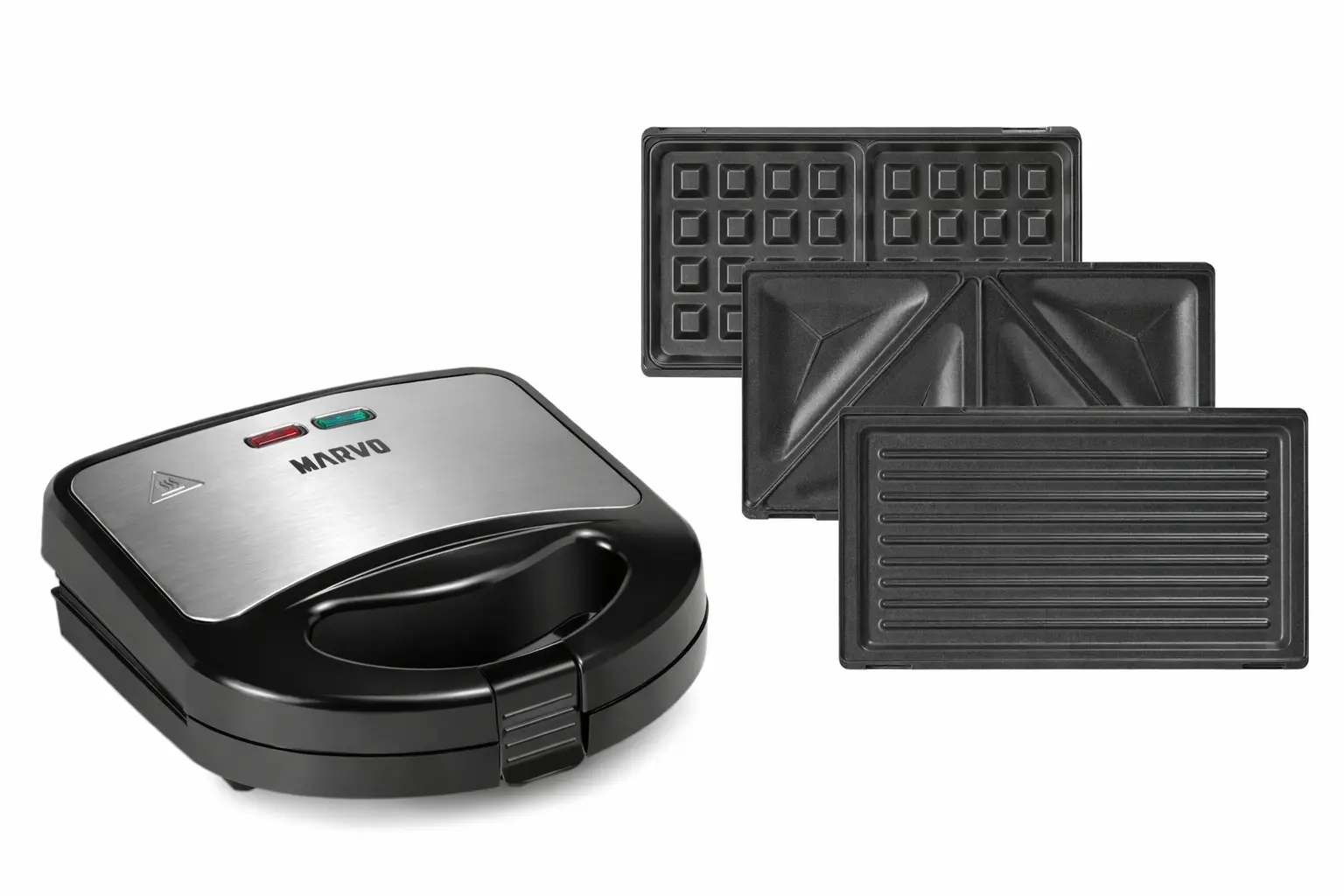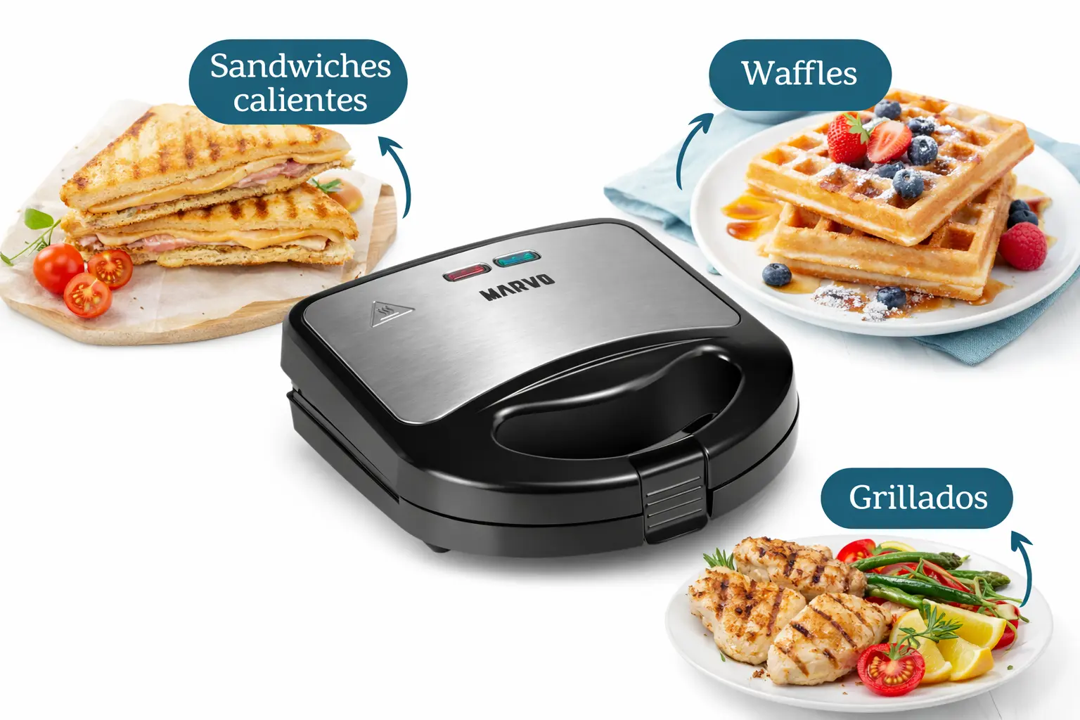 La Sandwichera Marvo 3 en 1 es una solución práctica para quienes quieren cocinar rápido sin complicarse. Con un solo equipo podés preparar sándwiches, waffles y grillados, gracias a sus placas intercambiables.